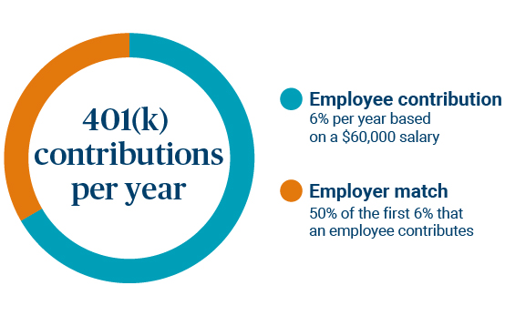 If you have an employer-sponsored retirement plan such as a 401(k), contribute at least enough to qualify for the maximum matching contribution from your company, if one is offered. Think of the match as free money — missing out means passing up on additional contributions that can add up to a significant amount of money over time.