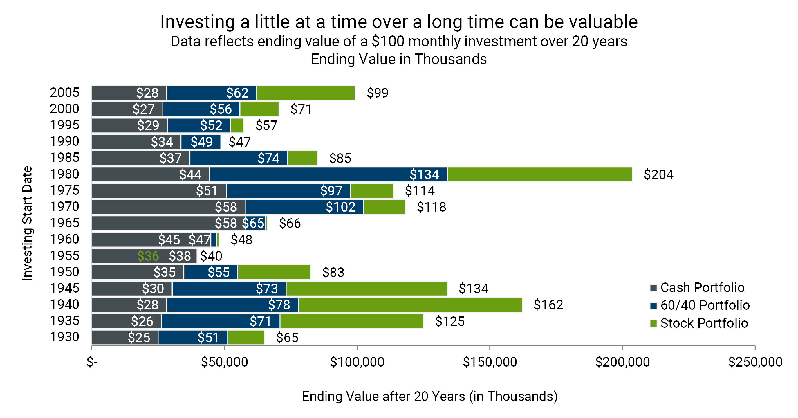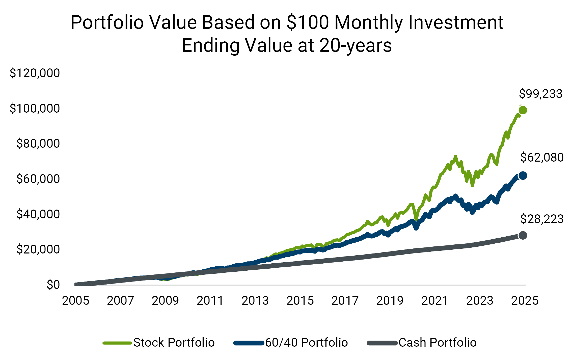 As the Ameriprise chart above shows, sourced from Ibbotson Associates data on stocks, bonds and cash, simple disciplined saving over twenty years adds up and can build significant wealth over time. In this example, starting from a $0 balance, a $100 monthly investment ($24,000 cumulatively over twenty years) grew to almost $100,000 if invested in large-cap U.S. stocks. The same 20-year investment grew to over $60,000 if invested in a 60% stock/40% bond portfolio (measured by the Bloomberg U.S. Aggregate Bond Index) and nearly $30,000 if invested in cash, represented by 30-day U.S. Treasury bills.