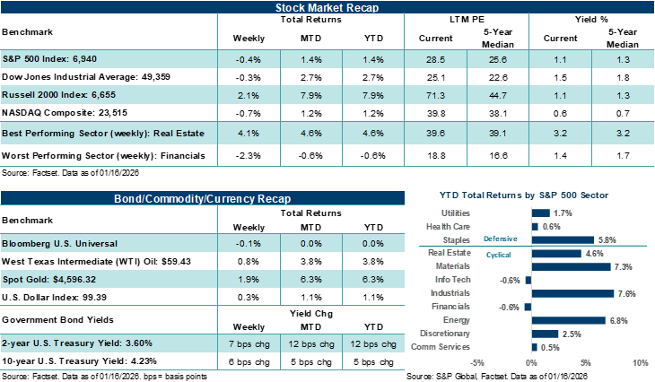 On those fundamentals, FactSet estimates show S&P 500 Q4’25 earnings per share (EPS) growing by over +8.0% year-over-year on revenue growth of +7.7%. That said, investors have likely already built into their expectations that companies, in aggregate, will top those estimates during the reporting season, given historical precedent. On a positive note, bank results last week pointed to a pretty steady consumer and business backdrop, but with a few caveats. Notably, credit trends remained solid, and management commentary and outlooks on consumers and small businesses were generally constructive, while investment‑banking and underwriting activity improved from last year’s lows. However, net interest income and deposit costs were mixed across the major banks, and expense control was an area of focus for investors, which is why stocks reacted “selectively” to results last week despite healthier deal pipelines and ongoing capital return. In our view, bank fundamentals are solid, which provides a positive start to the earnings season. Of course, investors will want to see this generally healthy backdrop spread across more companies, industries, and sectors as the earnings season now kicks into gear.