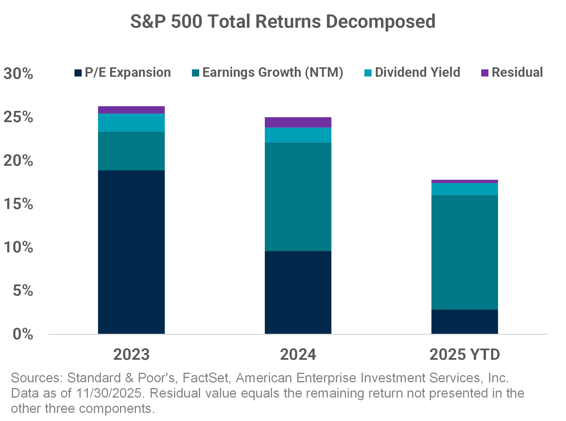 In our view, markets are poised to enter 2026 with a constructive backdrop, despite elevated stock valuations and growth expectations across Big Tech. Recent volatility within the AI space here at the end of 2025 has been a healthy reminder to investors that scrutiny of aggressive growth forecasts is intensifying, following three strong years of U.S. equity gains that have been highly concentrated in Big Tech.