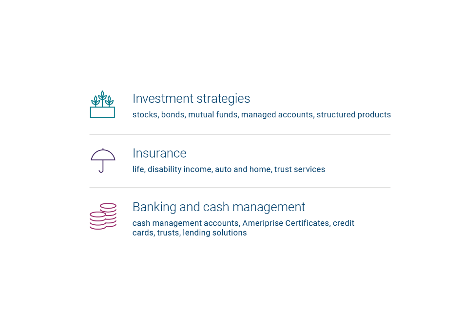 Using a wide variety of product solutions and investments can help you prepare for the expected and unexpected. Our financial advisors can suggest a range of solutions from Ameriprise and other firms for investments, insurance, annuities and banking. Recommendations for investments and products also factor your risk tolerance and the time horizon for your goals. Whether you need investment strategies, insurance, brokerage services or other solutions, a financial advisor can help you make decisions for your financial future.